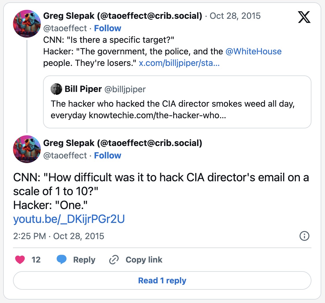 No? OK, maybe it will be about a month later, when the same group, “Crackas With Attitude”, hack into the email of the FBI Deputy Director tasked with tracking them down?