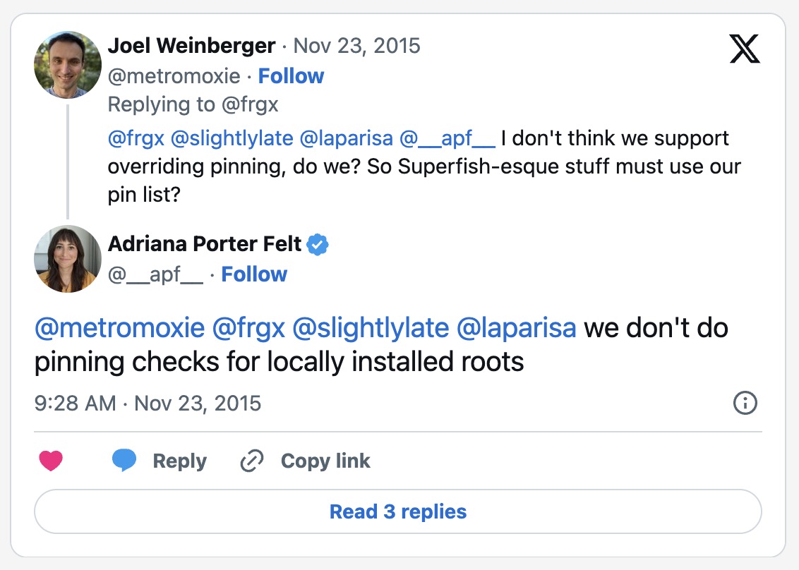 This root store bypass is a backdoor that completely subverts the purpose of certificate pinning. After Superfish 1, 2, and 3, we should question the wisdom of a policy that has repeatedly left hundreds of thousands of people vulnerable for very questionable reasons.