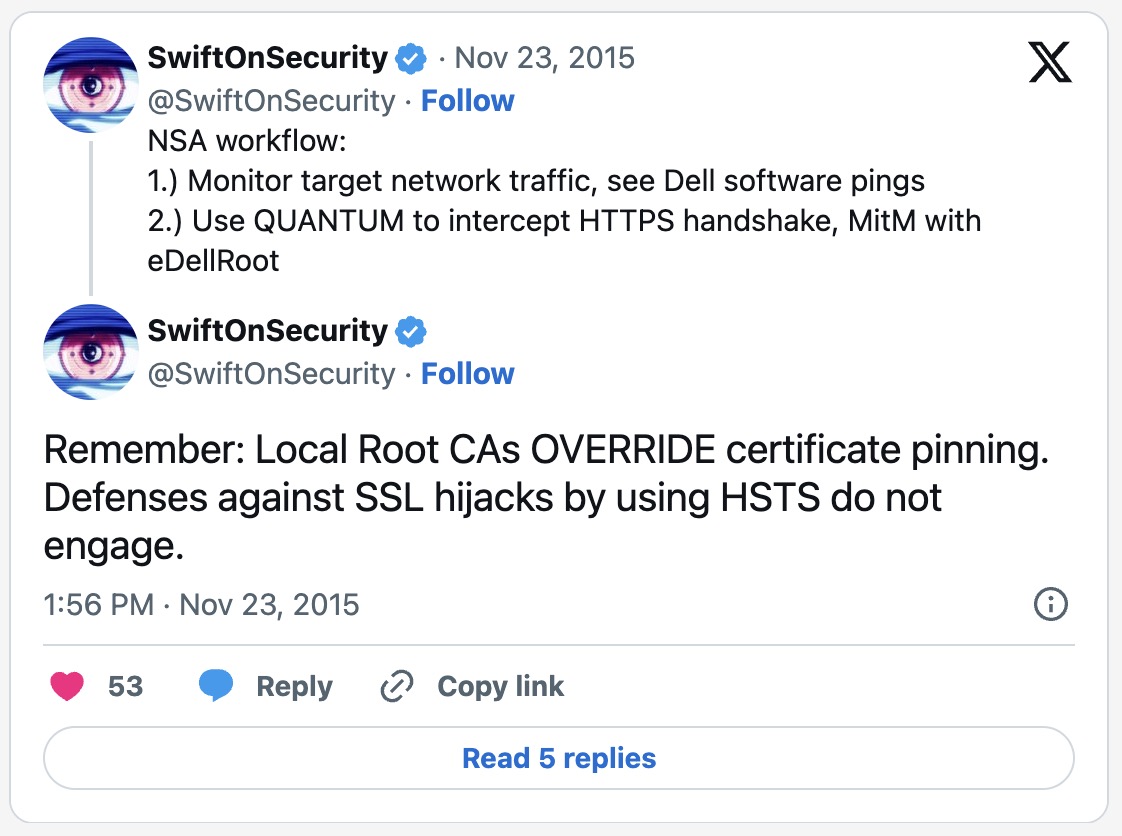 While reading tweets about Dell's customer abuse, I noticed this tweet from @SwiftOnSecurity:“Remember”, she said, “Local Root CAs OVERRIDE certificate pinning.”