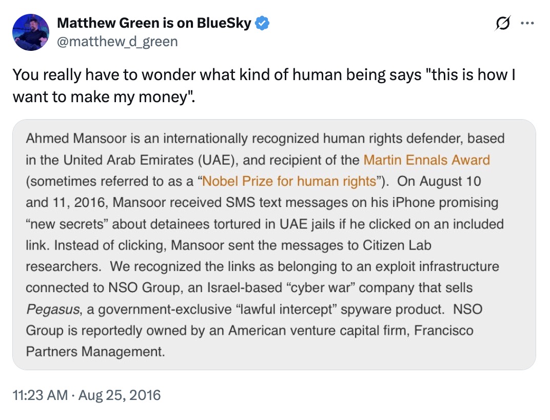 - Assist in the advertising of the now-permanently-compromised magic internet money. “Trust us. It’s private. And it’s safe—we’ve got Matthew Green!”